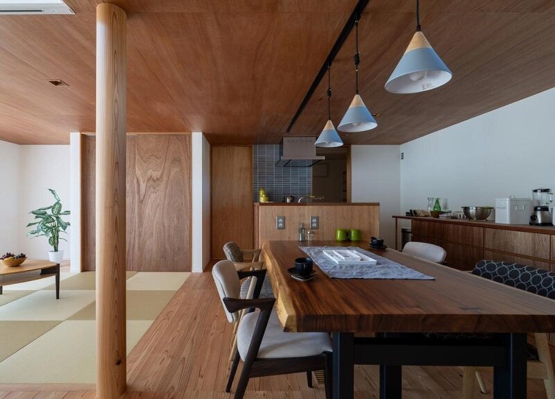 床材は無垢の杉板。天井や建具にはラワンベニヤを使用したほか、丸柱が見た目のアクセントに。重厚なダイニングテーブルも空間に溶け込んでいる。