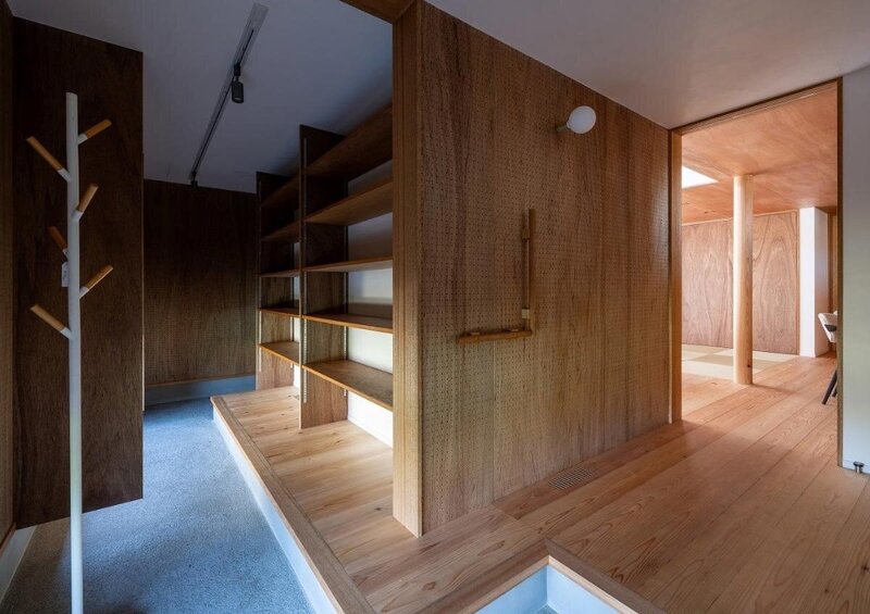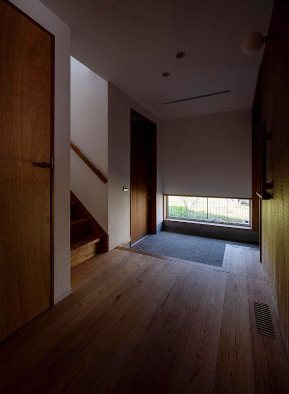 地窓を設置した玄関ホール。壁には帽子やバッグなど様々なモノが引っ掛けられるよう有孔ボードを完備している。