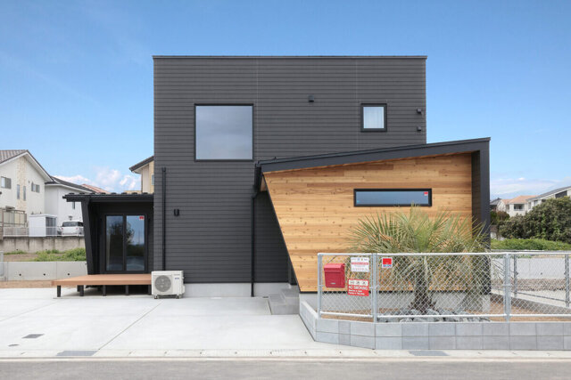 ブラックのよろい調のサイディングに天然木の斜壁が映える外観は存在感抜群!