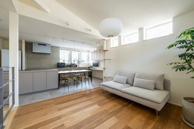 共働きのAさん夫婦がイメージしたのは、「忙しい毎日を楽しく暮らし、ゆっくりやすめる家」。1階の天井はレッドシダーの羽目板張り、床には素足が心地いいナラの無垢材を採用し、温かみのある空間に。L字カウンター付きのキッチンや回遊性のある家事動線、スキップフロア、雲梯など家族の個性とこだわりに対応した住まいが出来上がった。
