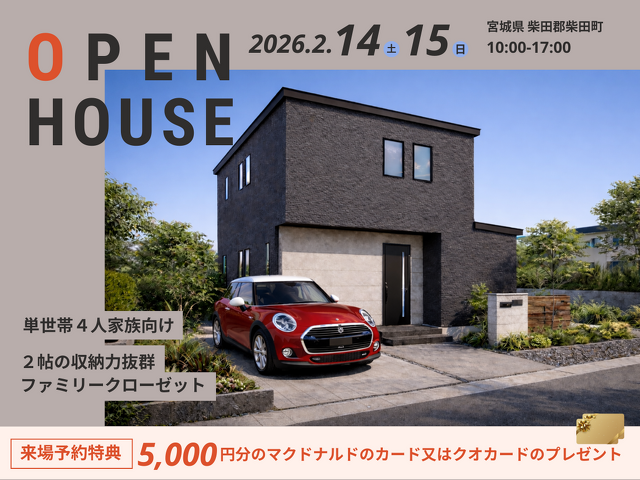 2/14(土)、15(日)開催【単世帯4人家族向け】「2帖の収納力抜群ファミリークローゼット」完成現場見学会