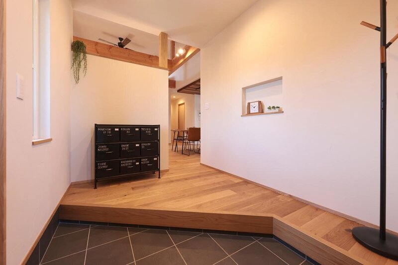 玄関ホールはダークなタイルでシックにコーディネート。また、壁の上部をOPENにして、奥行きを感じられるように設計。完全に仕切らずに済むのも性能が高い証だ。