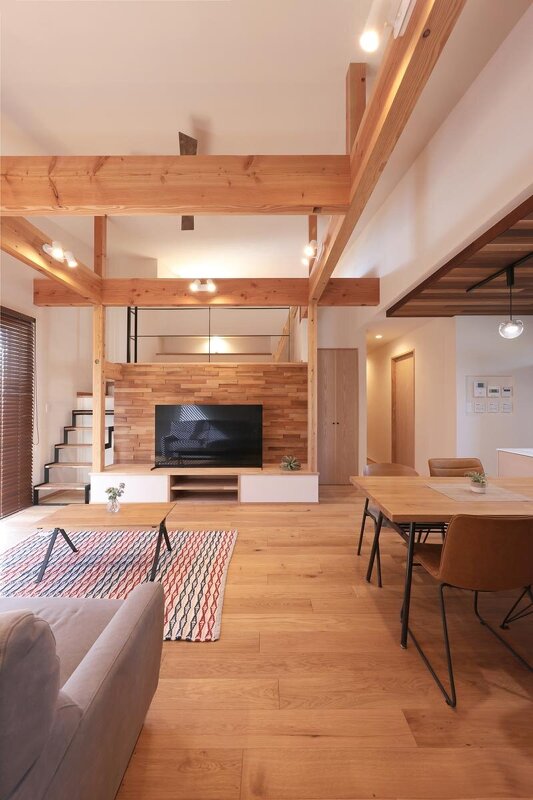 TVボードは大工の手づくりで、背面の壁はウッドパネルを用いて立体感や奥行きを演出するなど陰影が実に美しい。そして鉄骨とタモのスケルトン階段もオーダーの逸品。