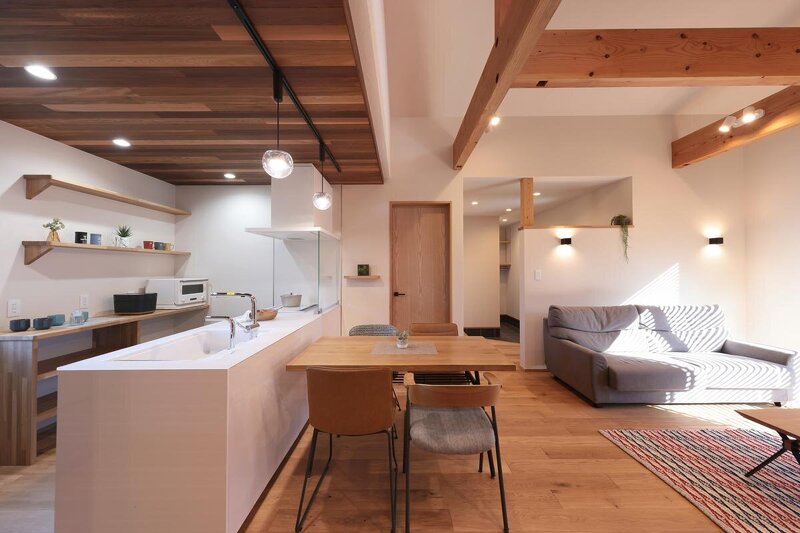 オークの床と珪藻土の壁が綺麗にまとまったLDK。吹き抜けによって開放感も得られる。キッチンの天井に張ったレッドシダーがアクセントに。