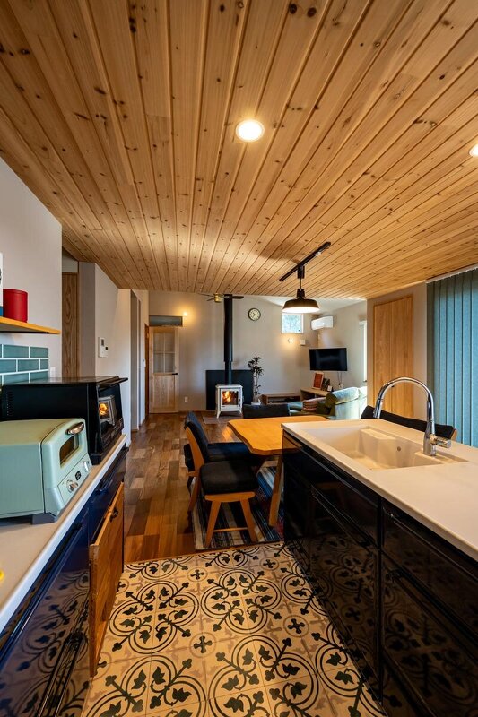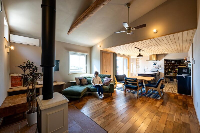 リフォーム・リノベーション、平屋、ウォークスルークローゼット、書斎、ロフト・小屋裏、造作家具・建具、大黒柱・梁の現し、自然素材をふんだんに使用、古材、薪ストーブ・ペレットストーブ、木造軸組工法、断熱改修、フルリノベーション、参考価格:中古住宅購入費400万円+リノベーション費2、200万円=総額2、600万円、窓:YKK APW430 壁断熱:セルロースファイバー105k+EPSボード80mmの付加断熱 屋根断熱:セルロースファイバー300mm 基礎断熱:発泡ウレタンフォーム