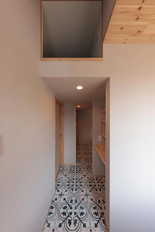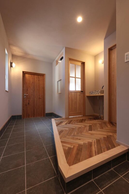 玄関扉を開けたときのインパクト、そしてカッコよさ。床はこだわりのヘリンボーン仕上げ。Iさんは取材中に何度「贅沢」「幸せ」という言葉を発したか分からないほど。