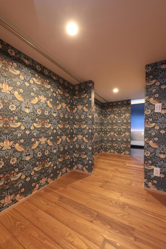 鮮やかなウイリアムモリスの壁紙が目を引くウォークスルークローゼット。主寝室とキッチンの双方から行き来できる。