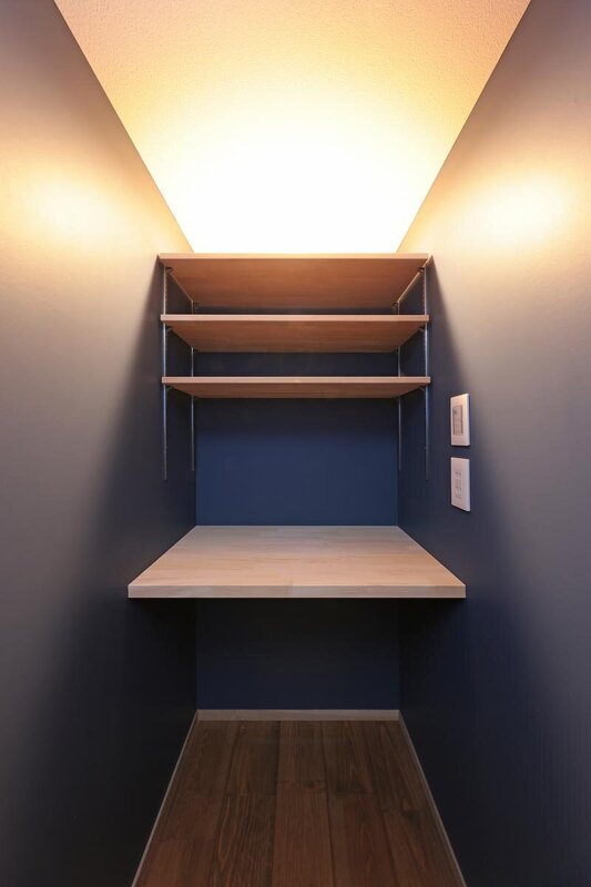 間接照明の輝きに目を奪われる書斎。非日常感のなか、パソコンや読書に没頭できる。