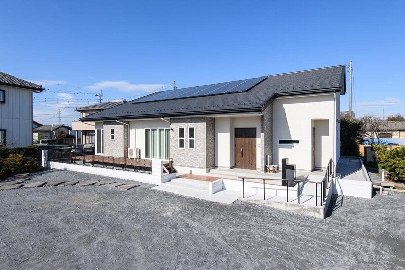 広い敷地を生かした“おおらかな平屋”は、Yさんご夫婦とご主人のお祖母さまが暮らす二世帯住宅。白を基調に石目調の外壁で変化をつけ、電力をまかなう太陽光パネルを10.5kW搭載した重厚な大屋根に、大容量蓄電池11.2kWhを装備し「電気を買わない暮らし」を可能にする「スマートプリーマHIRAYA」。