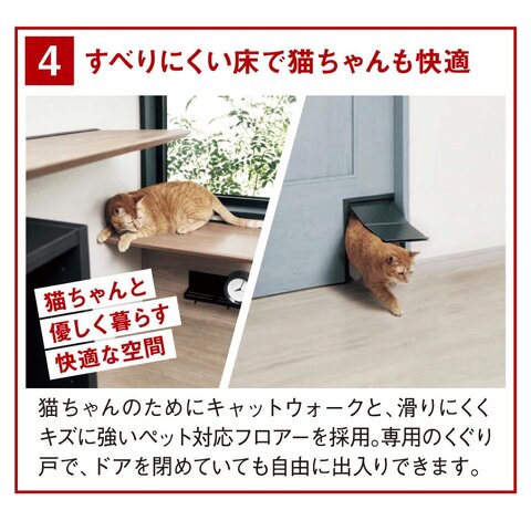 キャットウォークやくぐり戸、滑りにくく傷に強いペット対応フロアーで猫ちゃんも大満足!