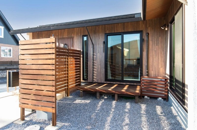 木製の目隠しにより中庭風になった庭では、人目を気にすることなく洗濯物が干せるほか、プールやバーベキューも気軽に楽しめる。