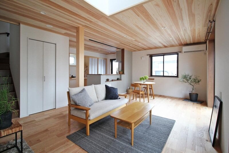 天井にはスギ、床にはナラを採用したぬくもりあふれるLDKは、吹き抜けで明るさを確保。優しい太陽の光が家族の寛ぎタイムを豊かに演出してくれる。