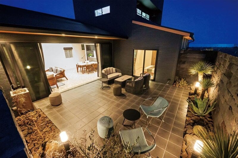光と影により幻想的な美しさを醸し出す夜の外観。重厚感ある石材をふんだんに使用することで高級感を演出。南国のトロピカルな植栽、おしゃれなロックガーデンで仕上げる。