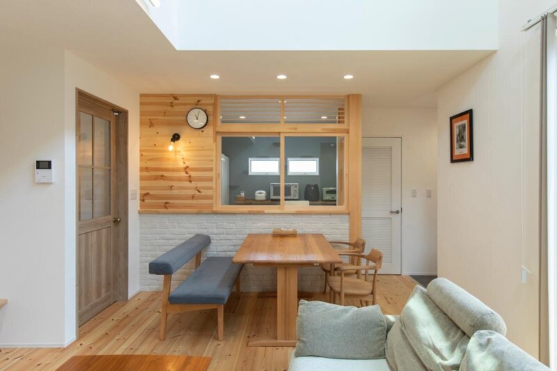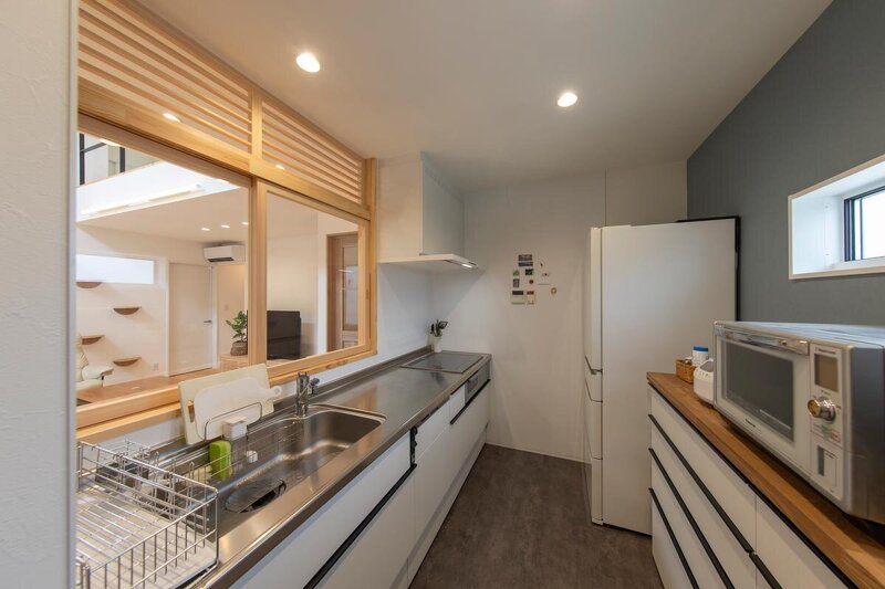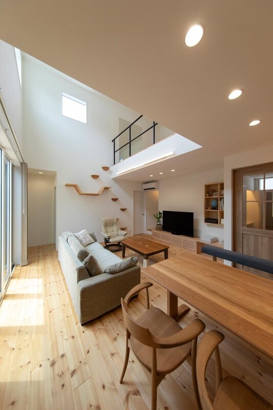 猫との暮らしを楽しみながら、ゾーンをしっかりと分けることで「共生」を叶えた住まい。自然を感じられるような外への緩やかな繋がりも見どころで、プライバシーを守りながら家族時間を楽しめる住まいとなっている。