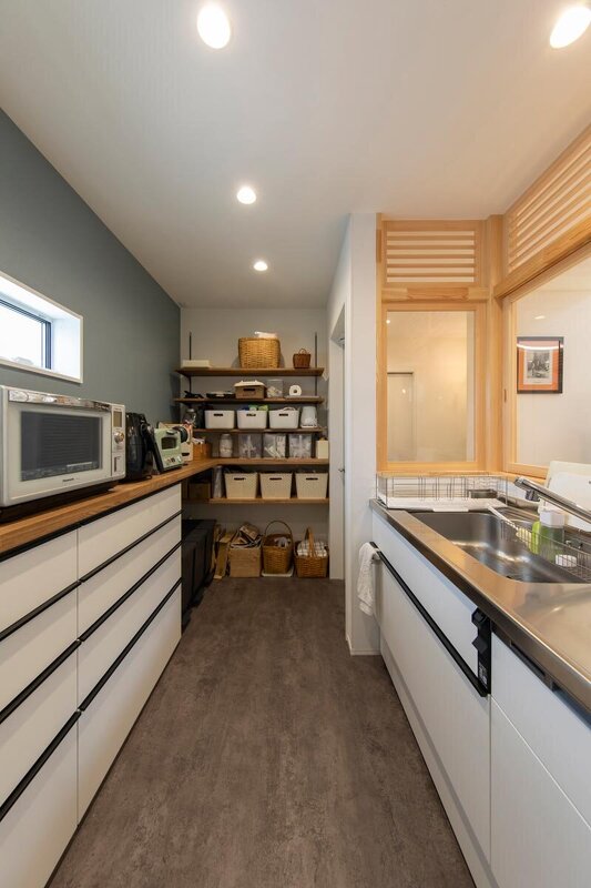 個室だからこそ、食料品などもオープンに収納できる。キッチンはキッチンで使いやすさを重視したつくりに。