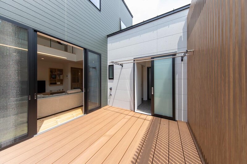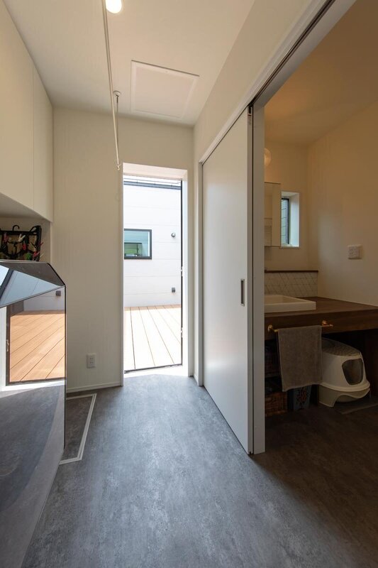 ランドリーから中庭へと続く動線。洗濯物の外干しも楽々。