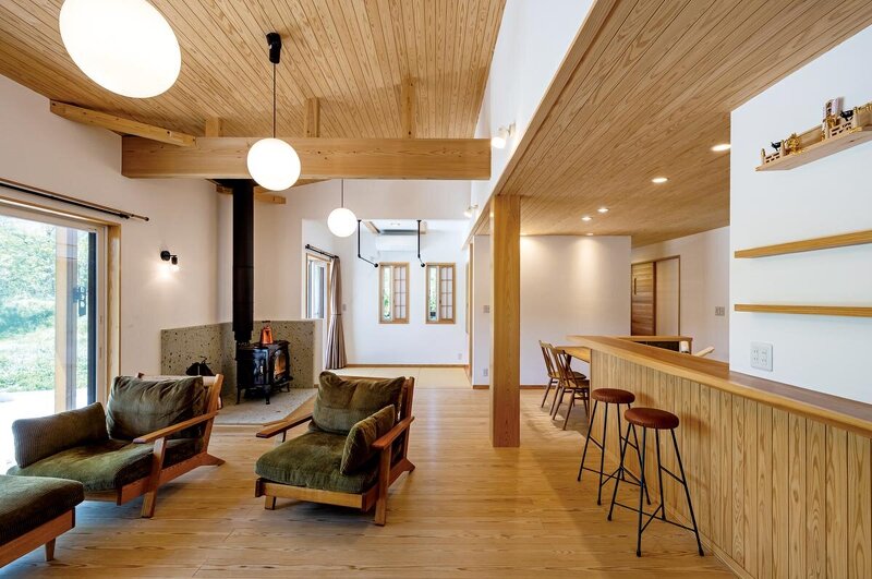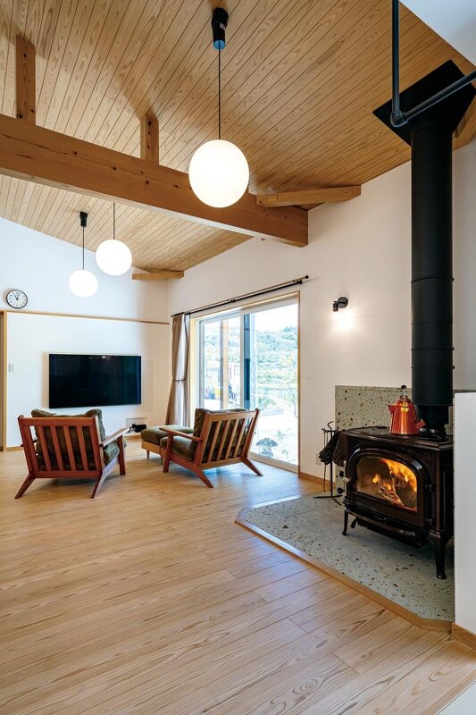 その心地よい暖かさが家中に伝わるよう住まいの中心に設置した薪ストーブ。大谷石との相性も抜群で、「自然の恵みに触れられる暮らし」という施主の夢を見事にカタチに。