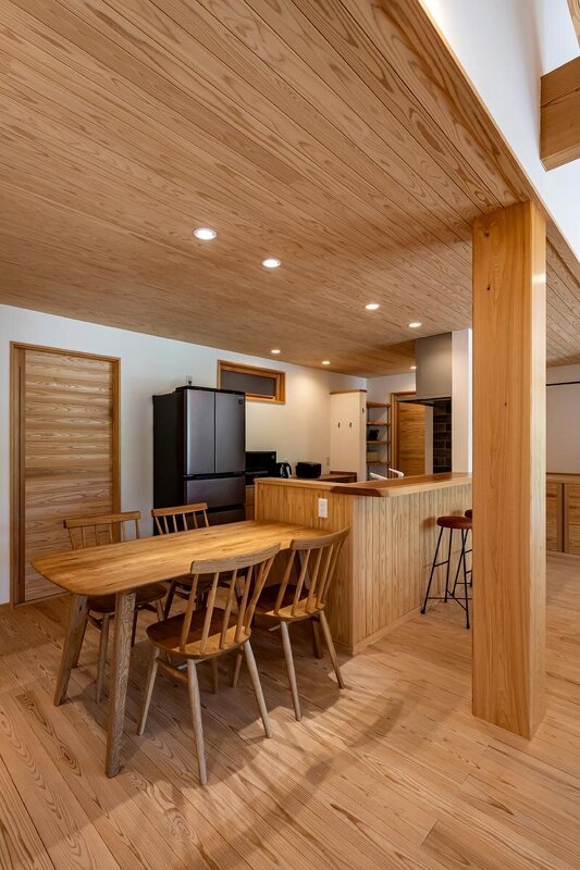 大黒柱に支えられた、木の温もりにあふれた横並びのダイニングキッチン。寒冷地に建つが、断熱性が高いため夏も冬も室内は快適そのもの。
