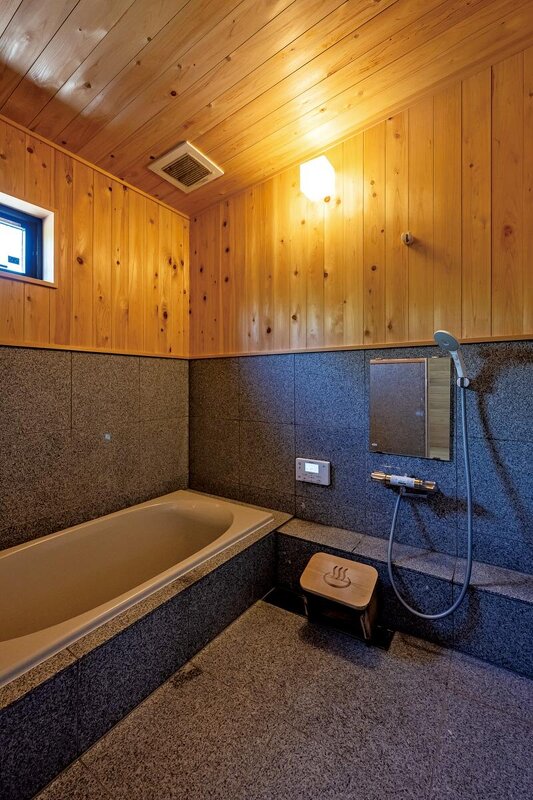 毎日、温泉気分が楽しめる造作の浴室も松浪建設の「真骨頂」と呼べる空間の一つ。壁は檜、床は御影石だ。