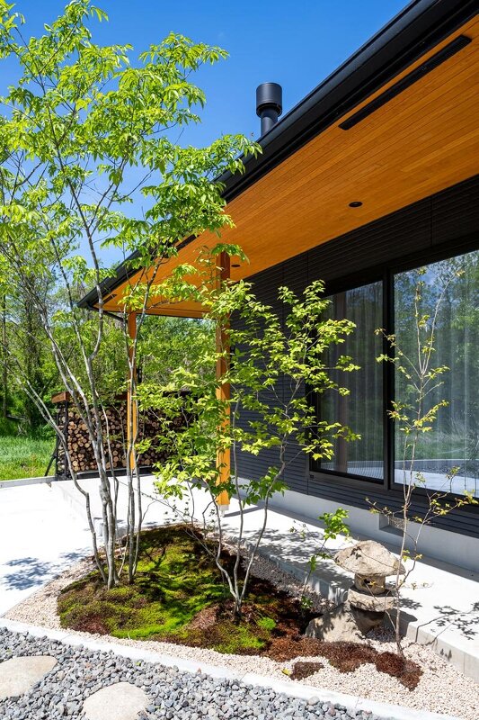 周囲に広がる新緑と、重厚さを醸し出す漆黒の外壁による鮮やかなコントラストに目を奪われる。また、屋根が四方へと緩やかに傾斜する伝統的な「方形屋根」を採用。