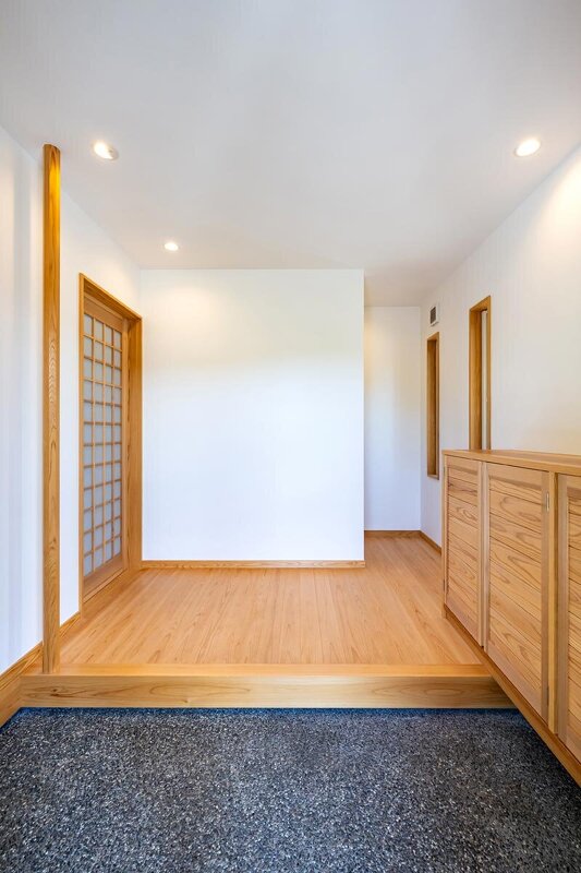 洗い出し仕上げの土間、造作の収納と建具。端正な佇まいの玄関ホール。