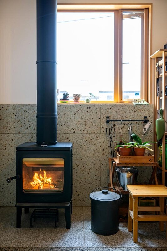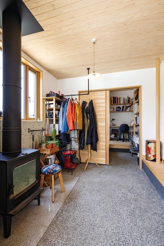 引き戸を開放すれば玄関の通り土間と繋がる。冬は段差部分に腰掛けて薪ストーブの火を熾したり、のんびりと炎を眺めるのも良し。
