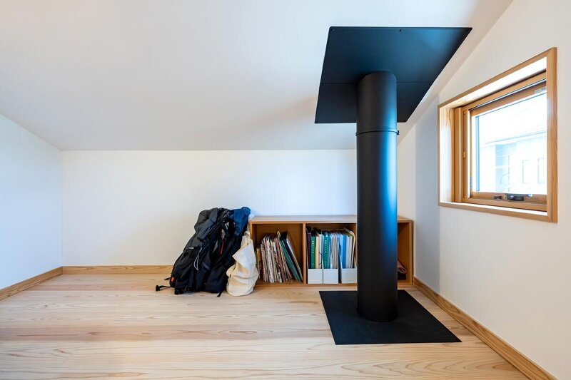梯子を上がった先にお目見えするロフト。薪ストーブの煙突が繋がっており、冬は輻射熱によってTシャツで過ごせるほど暖かい。