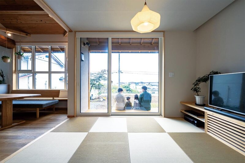 独立した和室では「物置になる」と考え、家族が気軽に使えて、気の向くままに寝転がれる「畳リビング」を実現。TVボードなどの家具や建具は造作で対応。