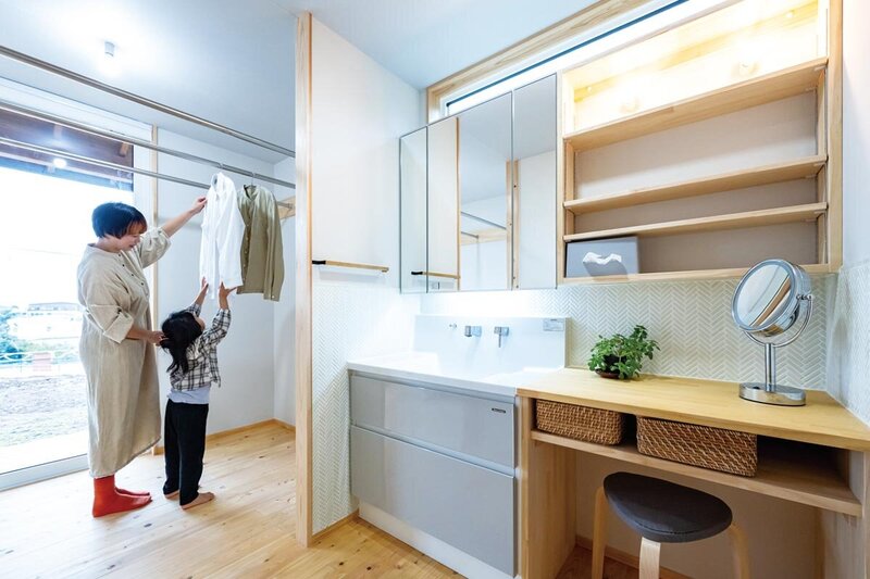 パウダーコーナーを兼ねた洗面室と、3帖ほどのランドリールーム。ハンガー中心のファミリークローゼットも隣接しており、「洗う~しまう」が短い距離で完結。