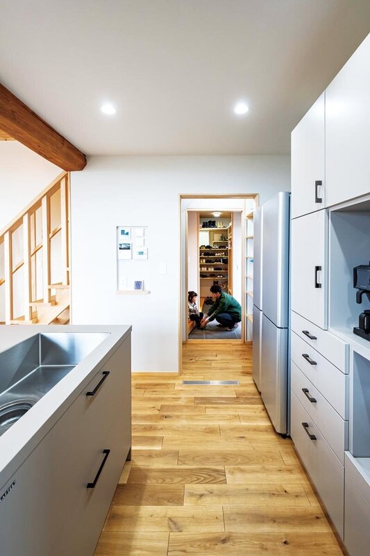 土間収納とセカンドシンクを完備した玄関から、パントリーを経てキッチンに直通する帰宅動線。買い物袋もラクに運べて、「負担が減って本当に動きやすい」と奥様も大絶賛。