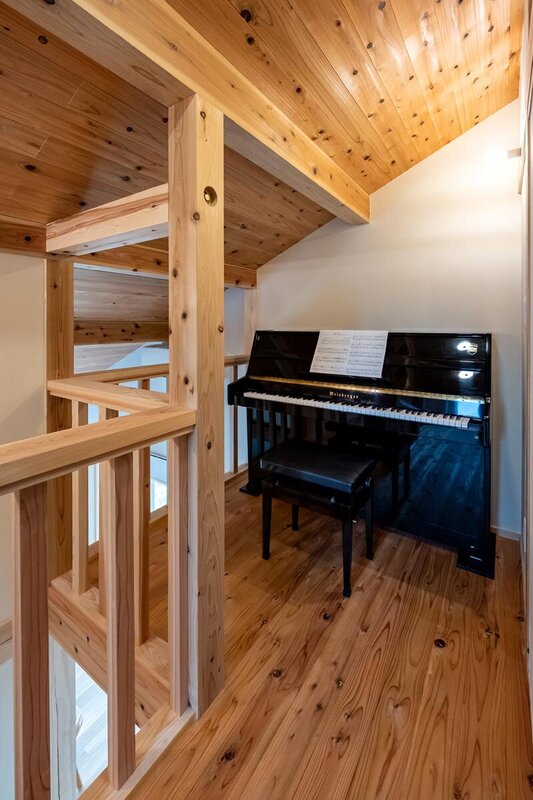 吹き抜けに面した2階ホールにはピアノを設置。奏でる音色が家中に心地よく響くだろう。