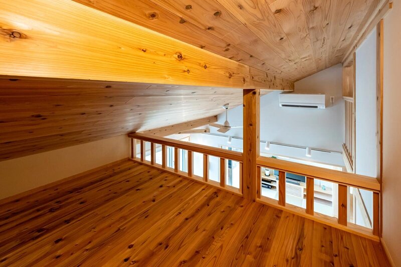 邸内は柱や梁を現した真壁造り。空気の循環、そして室温を一定に保つことを目的とした吹き抜けにはロフトも完備している。