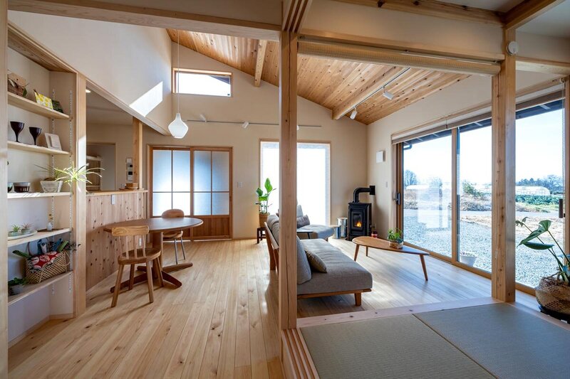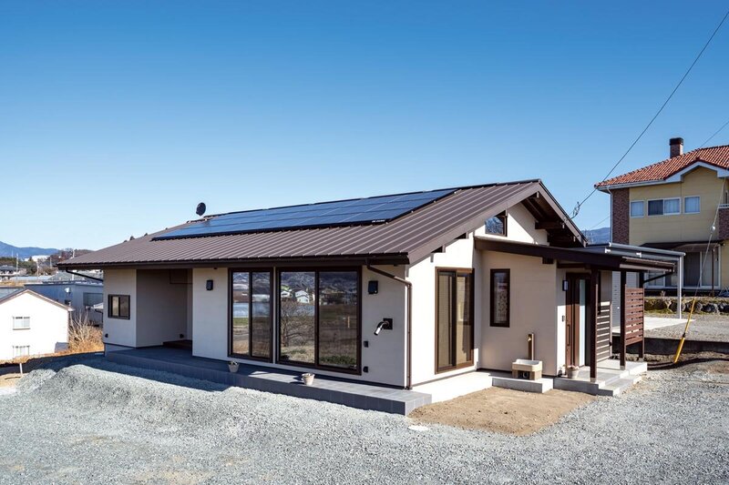 新築、平屋、延床面積30坪以下、室内の様子が見えない、家事がしやすい、景色・景観を楽しむ、ZEH(ゼッチ)、パッシブデザイン、付加断熱、全館空調、床下エアコン、造作キッチン、中庭、土間リビング、ランドリールーム・サンルーム、自然素材をふんだんに使用、太陽光発電システム、薪ストーブ・ペレットストーブ、木造軸組工法、UA値=0.38、C値=0.3