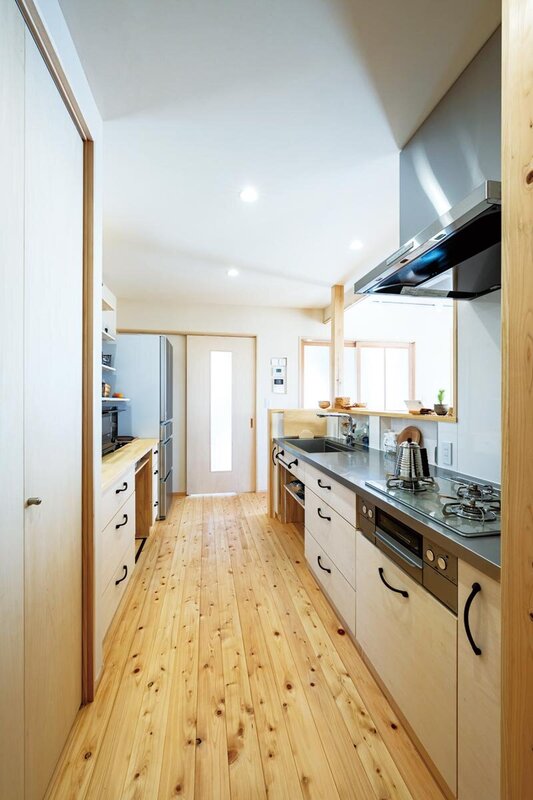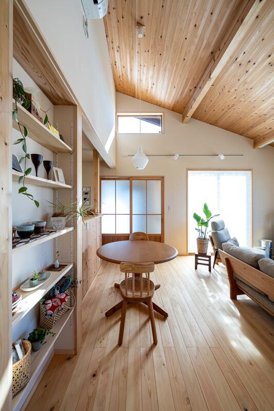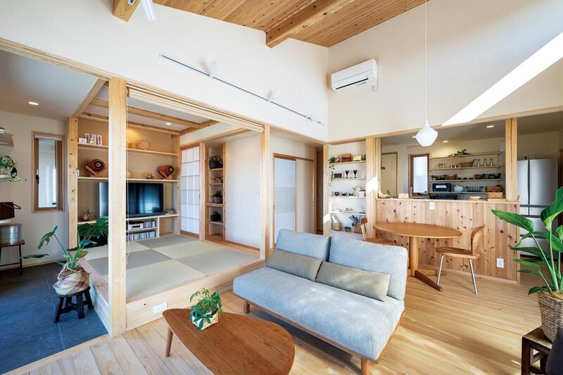 地元産の檜や杉をふんだんに使用した邸内は、畳コーナーの小上がり部分をはじめ、全ての建具や飾り棚を手づくりするなど、奥様の期待以上の完成度でカタチに。