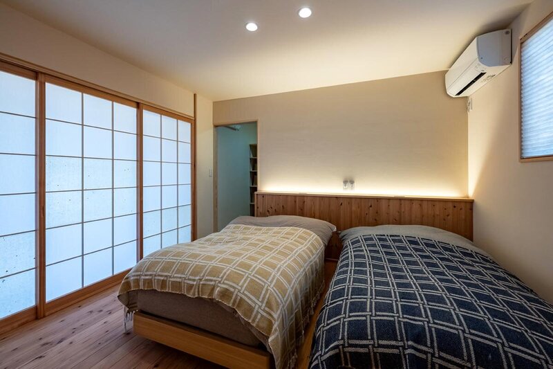 「普通の腰壁では芸がない」と取り入れた間接照明の優しい灯と障子が調和した、安らぎの主寝室。