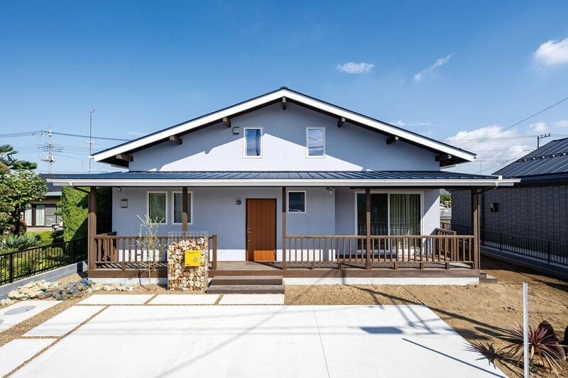 海辺に佇むイメージでデザインした爽やか&落ち着いたブルーグレーの塗り壁が目を引くアメリカンスタイル。三角屋根の効果により2階建てにも関わらず、まるで平屋のよう。
