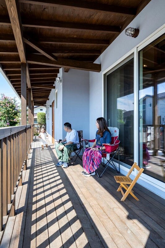 真夏でも庇が直射日光を遮り、木陰のような環境を創り出すカバードポーチ。「いずれはハンモックを吊るして、子どもと一緒にのんびり過ごしたい」と奥様。
