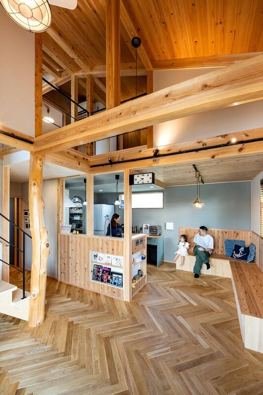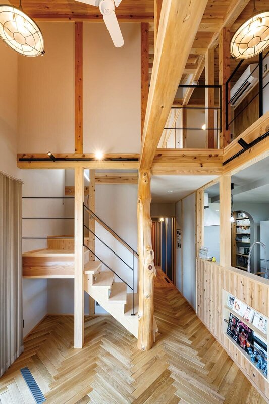 造作の折り返し階段と共に現した大黒柱は檜。同社の所有する山で伐採したもので、節を残した原木のままの姿はまさに「世界に一つ」と評しても支障ない。