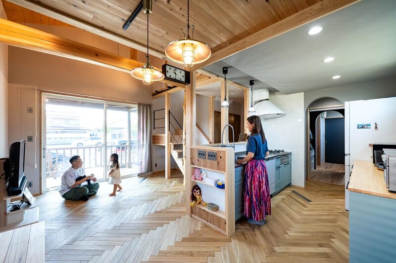 ナラの無垢床は奥様憧れのヘリンボーン仕様。ただ真っ直ぐ張るよりも表情が生まれ、見た目にもカッコいい。
