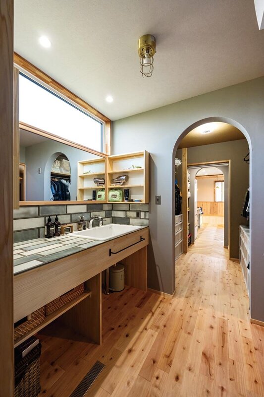 洗面台の天板は個性的なデニムタイル。WTC→パントリー→キッチンと直線で繋がる動線も◎。