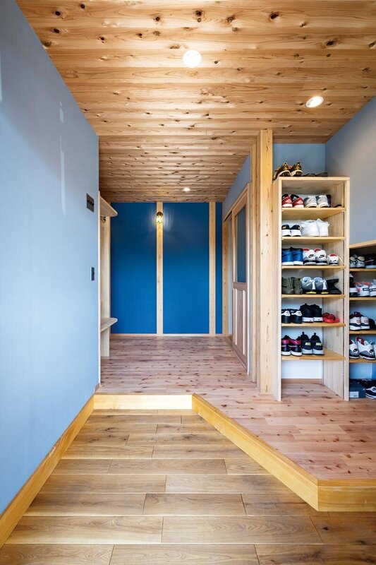 同じ珪藻土壁でも、空間によって色合いを変える遊び心も。玄関ホールはインパクトのあるネイビー。
