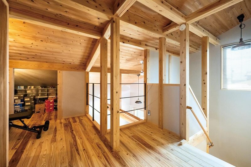 木の比率を高めたぶん1階以上に温もりが感じられる2階ホール。ご主人の筋トレスペースとして重宝されているほか、抜群の収納量を誇る小屋裏も完備。