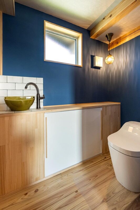 ペンダントライトの淡い灯と、やはり造作で家族のイメージ通りに仕上げた手洗い台が印象的なトイレ。