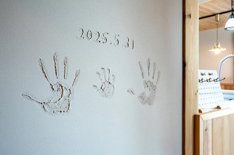 家づくりの記念と、リビングの塗り壁にご家族の手形を遺している。