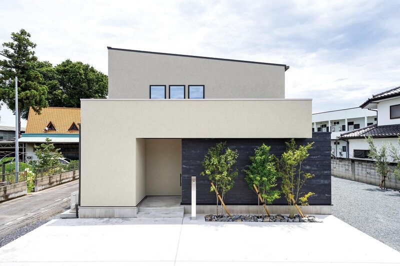 メインファサードとなる西側の外観デザインのベースはセメントの質感を活かした斑模様が豊かな表情を生み出す「ソリド」。グレージュの塗り壁とも見事に調和している。