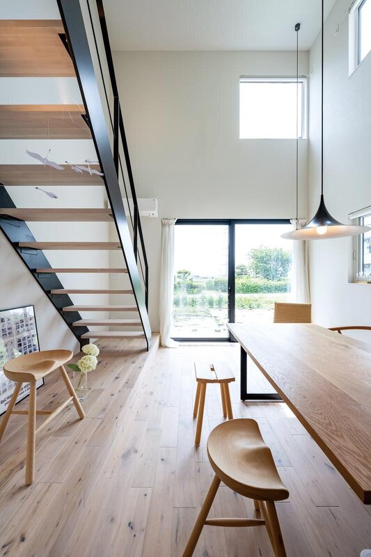 白・木・グレーによるカラーコーディネートを基本としたなかで、絶大な存在感を発揮するのが吹き抜けのスケルトン階段。奥様が「絶対に実現したかった」こだわりの一つ。