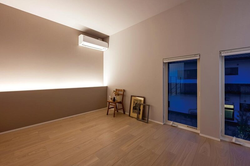 間接照明を組み合わせることで、ふかし壁の立体感がさらに際立つベッドルーム。リビングから繋がるスリット窓に設計士のセンスが覗く。
