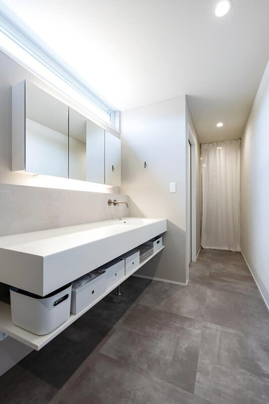 横幅のある天板に三面鏡。子どもが年頃を迎えても家族が並んで身支度できるオーダーの洗面台。