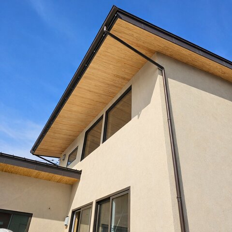 見上げる青空に、軒先の無垢の杉板がゆったりと浮かび上がり、唯一無二のほっこりとした住まいが完成しました。