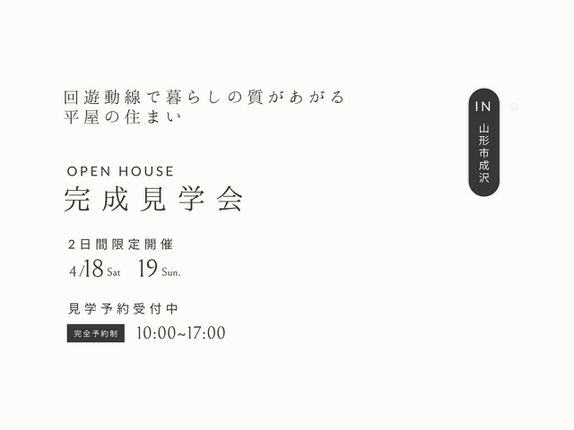 4/18(土)、19(日)開催 「回遊動線で暮らしの質があがる 平屋の住まい」完成見学会 ※完全予約制